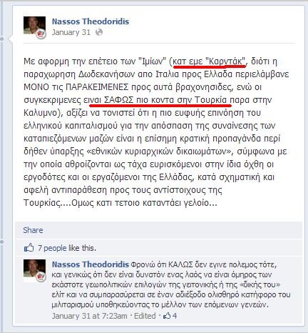 Ανήμερα της θλιβερής επετείου του 1996, ο κ. Θεοδωρίδης, στέλεχος του ΣΥΡΙΖΑ, έγραψε στη σελίδα του στο Facebook: «Με αφορμή την επέτειο των Ιμίων (κατ' εμέ Καρντάκ, διότι η παραχώρηση Δωδεκανήσων από Ιταλία προς Ελλάδα περιελάμβανε ων Δωδεκανήσων από την Ιταλία προς την Ελλάδα περιελάμβανε μόνο τις παρακείμενες προς αυτά βραχονησίδες, ενώ οι συγκεκριμένες είναι σαφώς πιο κοντά στην Τουρκία παρά στην Κάλυμνο»....